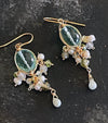 This enchanting "Chandelier" earring is a masterpiece of soft textures and ethereal colors. At its heart lies a serene Green Quartz, embraced by a frothy "bubble" of Freshwater Pearls, Prehnite, Sillimanite, and vibrant Peridot.